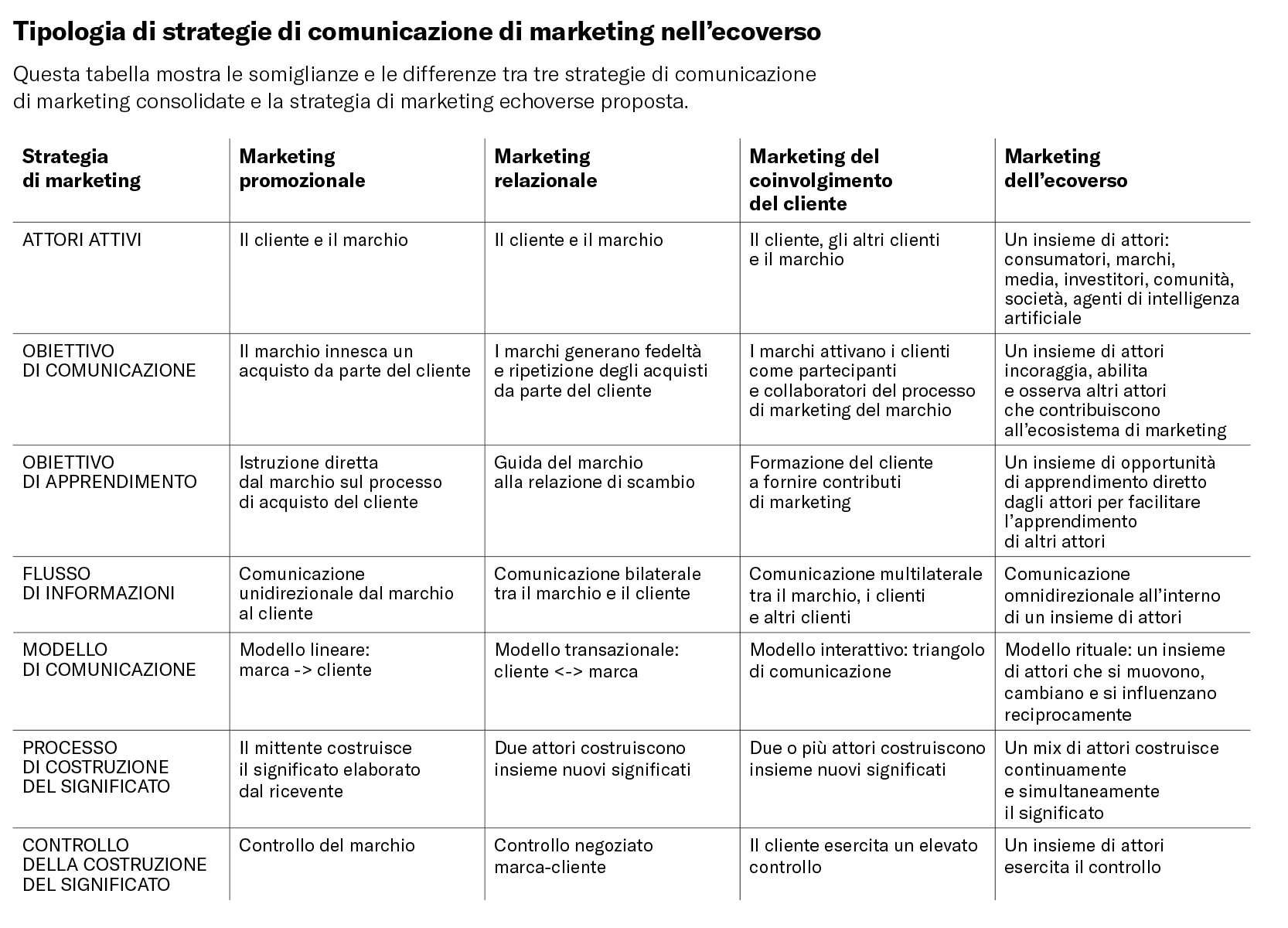 Storicamente, la comunicazione di marketing si è concentrata sul modo in cui le aziende (cioè i marchi) trasmettono messaggi ai loro stakeholder, mettendo al centro i clienti e gli investitori. Nell’era dell’echoverse, tuttavia, i confini del branding sono sempre più sfumati e ampliati. Un marchio può essere composto da entità tradizionali (organizzazioni, prodotti, servizi e luoghi) ma anche da idee, persone o comunità che comunicano un significato sociale e commerciale come un essere umano, un essere umano con assistenza IA e/o un agente IA. Considerando l’evoluzione della comunicazione di marketing verso un insieme di attori che comprendono, prevedono e co-creano la comunicazione nell’ecoverso, abbiamo integrato la teoria della comunicazione e le teorie della comunicazione di marketing, ottenendo una tipologia di strategie di comunicazione di marketing che consiste in tre strategie consolidate – (1) marketing promozionale, (2) marketing relazionale e (3) marketing di coinvolgimento del cliente – e la nostra strategia proposta, (4) echoverse marketing.