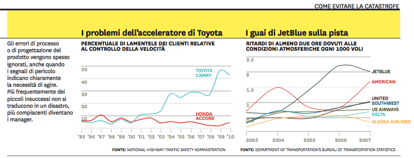 2 Trarre insegnamento dalle deviazioni. Come suggeriscono le crisi di Toyota e JetBlue, quando qualche aspetto dell’operatività si distacca dalla norma, la reazione dei manager è spesso ridefinire quello che considerano un rischio accettabile. La nostra ricerca dimostra che in questi casi i decision maker potrebbero comprendere chiaramente il rischio statistico rappresentato dalla deviazione, ma se ne preoccupano sempre meno.