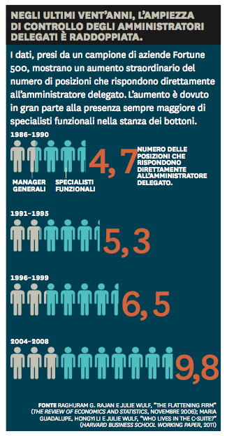 Se gli alti dirigenti sono sempre più carichi di responsabilità – e pochi sarebbero disposti ad affermare il contrario – perché dovrebbero mettere altra carne al fuoco? Sembra illogico ma, a quanto risulta da una nostra ricerca sui ruoli dirigenziali negli ultimi vent’anni, l’ampiezza di controllo di un amministratore delegato (quantificata in base al numero di riporti diretti) è in media raddoppiata: si parte dai 5 riporti circa della metà degli anni Ottanta per arrivare ai quasi 10 di vent’anni dopo. Questo balzo in avanti nella sfera di competenze degli alti dirigenti sembra ancora più anomalo se si considera che, rispetto alle generazioni passate, le aziende di oggi sono molto più complesse, disperse geograficamente in più Paesi e attentamente controllate.