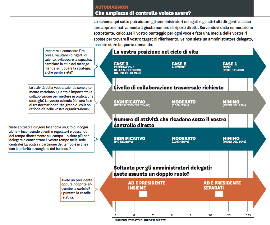 In questo articolo esamineremo come la portata del controllo si sviluppi logicamente e offriremo consigli per i manager lungo tutto l’arco della loro carriera. Suggeriremo cinque aree importanti da prendere in considerazione e ne approfondiremo tutte le implicazioni. Gran parte della nostra analisi è espressamente rivolta agli amministratori delegati, ma i punti trattati possono essere utili anche ai dirigenti di livello inferiore (almeno due gradi gerarchici più in giù dell’amministratore delegato) per costruire la squadra giusta per loro e per la loro azienda.