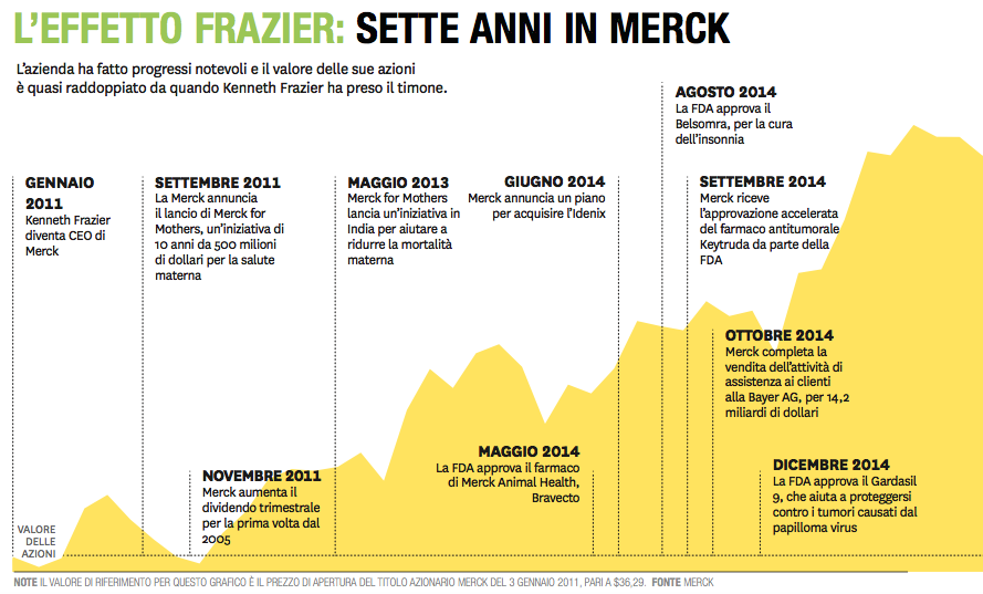 Di sicuro Frazier è uno capace di sparigliare i pronostici. Come direttore degli affari legali di Merck, il colosso farmaceutico americano, ha guidato la difesa nella vertenza sul Vioxx, un antidolorifico che ha dovuto essere ritirato dal mercato. Da quando è diventato amministratore delegato, nel 2011, ha ricevuto molti complimenti per aver stabilizzato l’azienda, impresa non da poco in un’industria scossa dai cambiamenti. Ha ridato prestigio al reparto ricerca e sviluppo dell’azienda e ha supervisionato nuovi lanci promettenti, come quello del farmaco antitumorale Keytruda.