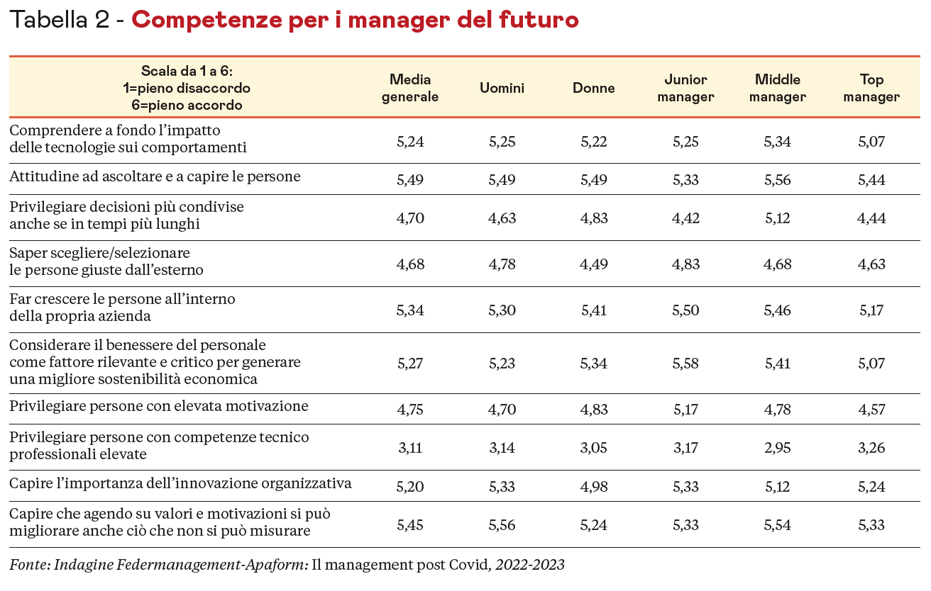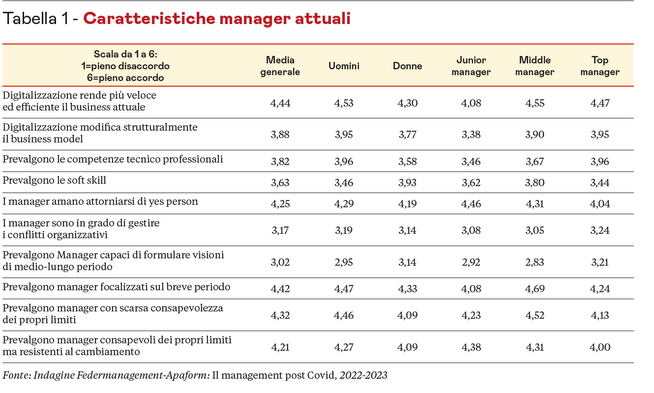 Apaform e Federmanagement, nel periodo novembre 2021-gennaio 2022, hanno svolto una ricerca inviando un questionario a circa 800 interlocutori ritenuti profondi conoscitori del mondo manageriale. La ricerca aveva il triplice obiettivo di: rilevare la percezione delle caratteristiche prevalenti dei manager attuali; evidenziare le principali caratteristiche che dovrebbero avere i manager del futuro; indicare il ruolo della formazione manageriale.