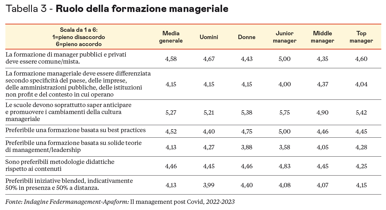Tuttavia permane un residuo del passato di cultura di separazione in quanto è elevato il numero dei rispondenti che ritiene che la formazione manageriale deve essere differenziata secondo specificità del paese, delle imprese, delle amministrazioni pubbliche, delle istituzioni non profit e del contesto in cui operano (media 4,15), perfettamente equivalente anche tra uomini e donne, e con limitata differenza tra junior manager, middle manager e vertice aziendale.