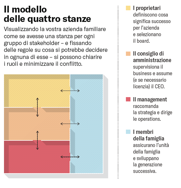 La governance di un'impresa familiare dipende sostanzialmente dalla capacità di trovare una mediazione tra micro-management e abdicazione di responsabilità, e diventa sempre più complicata man mano che crescono la famiglia e il business. Noi suggeriamo uno schema di riferimento piuttosto semplice per orientare il processo decisionale: è il modello delle quattro stanze. Immaginate la vostra azienda come una casa che ha una stanza per i proprietari, una per il board, una per il management e una per il resto della famiglia. I proprietari fissano obiettivi ambiziosi ed eleggono il board; il board supervisiona il business e assume (e licenzia se necessario) Il CEO; e il management raccomanda la strategia e dirige le operations. Poiché il board e il management riportano ai proprietari, le prime tre stanze sono sovrapposte e intercomunicanti, con quella dei proprietari in cima. La stanza della famiglia, che è determinante per mantenere il legame emotivo dei suoi membri con l'azienda, affianca le altre tre, a sottolineare l'influenza e l'unità della famiglia.