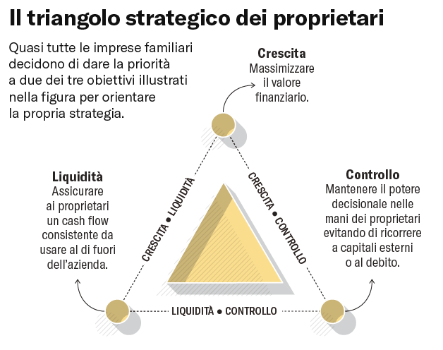 Ci saranno inevitabilmente dei trade-off tra queste opzioni. Potreste perseguire un solo obiettivo, o una combinazione di obiettivi. Noi abbiamo scoperto che per quasi tutte le imprese familiari, questa è una situazione "due su tre", nel senso che devono dare la priorità a due obiettivi a spese del terzo. Ne derivano tre strategie di base – una per ogni possibile abbinamento di obiettivi – ognuna delle quali forma un lato di quello che definiamo il triangolo strategico dei proprietari.