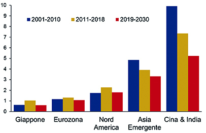 Il combinato disposto di invecchiamento della popolazione e del relativamente scarso progresso tecnologico ha determinato i bassi tassi di crescita del prodotto potenziale delle economie avanzate a cui assistiamo da decenni – e presto, una volta terminato il processo di catch-up tecnologico, anche dei Paesi emergenti.