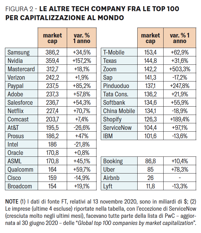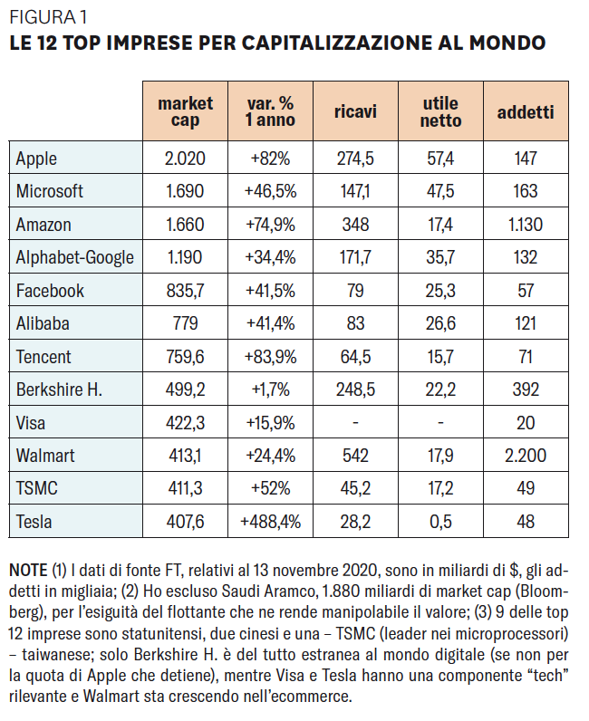 - le “big five” statunitensi (Apple, Microsoft, Amazon, Alphabet-Google e Facebook), che occupano (figura 1) le prime cinque posizioni nella classifica mondiale per capitalizzazione con un valore complessivo (al 13 novembre 2020) di 7.400 miliardi di dollari circa – oltre il 60% in più rispetto a un anno prima a fronte della crescita del 15% dello S&P 500 (il divario sarebbe ancora più consistente se si escludessero le “big five” stesse dal computo del notissimo indice statunitense) – e, anche se non sempre,