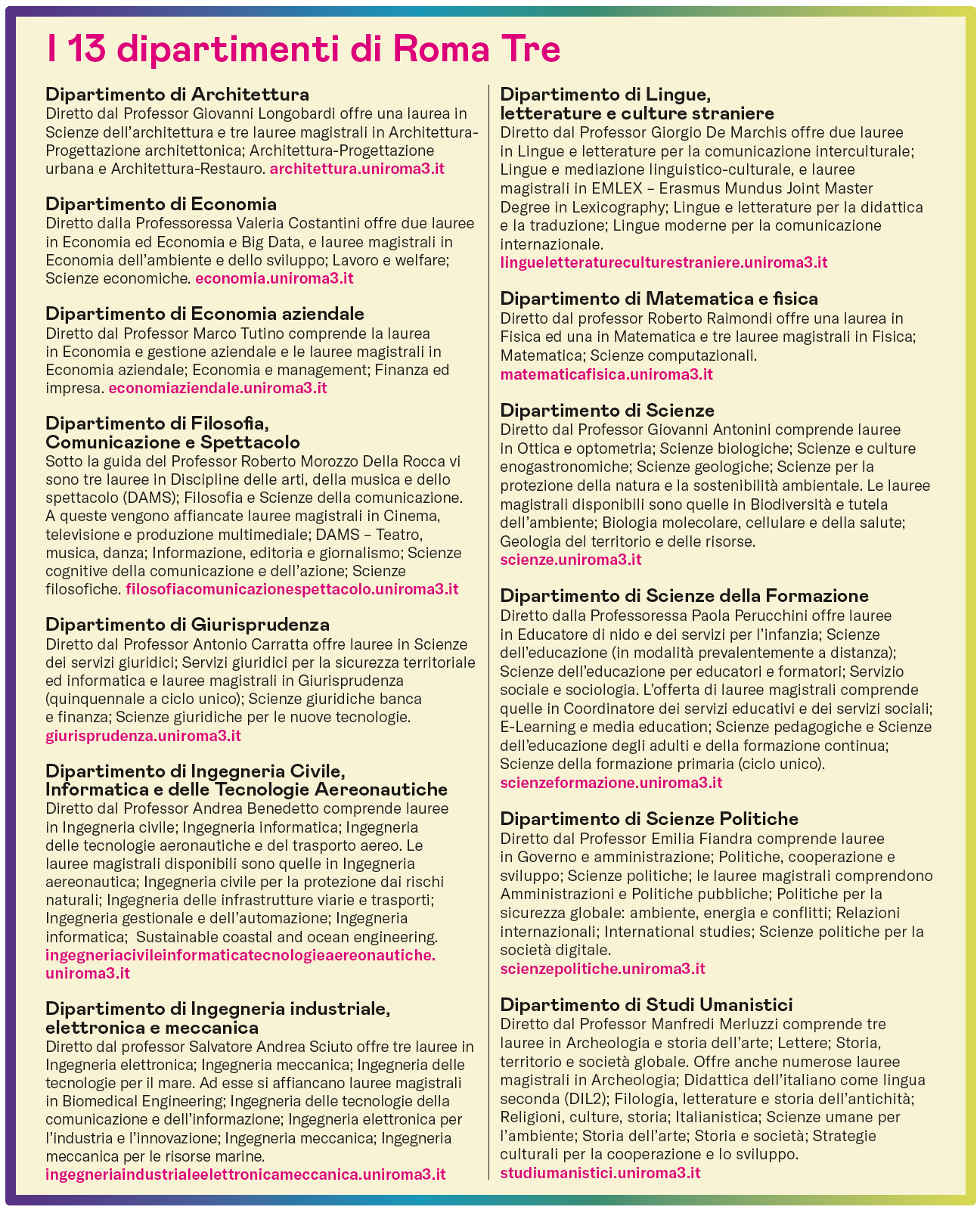 In un Paese che vanta l'accademia più antica d'Europa, l'università degli Studi di Bologna (1088), e numerosi altri atenei con lustri di storia alle spalle, Roma Tre con i suoi soli 30 anni vita potrebbe sembrare un topolino. E, invece, ha saputo sfruttare al meglio il vantaggio del newcomer – si direbbe in linguaggio economico – in un ambito ancora condizionato nel suo ordinamento da un testo normativo degli anni '30, raggiungendo il secondo posto nella capitale e posizionandosi tra le prime 15 università a livello nazionale.