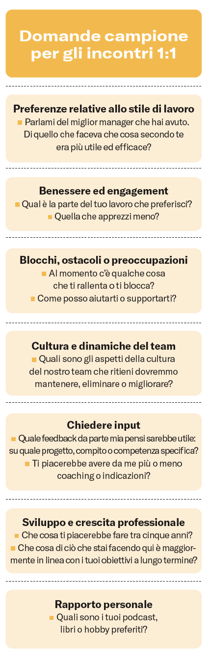 Un’avvertenza: entrambi questi approcci tendono a dare la priorità a questioni tattiche immediate e urgenze da affrontare. Comunque elaboriate l’odg, inseritevi periodicamente degli argomenti di respiro temporale più ampio, quali pianificazione della carriera e opportunità di sviluppo. Si possono o dedicare loro 5 o 10 minuti a ogni incontro, oppure un incontro intero ogni tre o quattro (si veda il riquadro “Domande campione per gli incontri 1:1” per farsi un’idea dei punti che andrebbero discussi nel tempo).