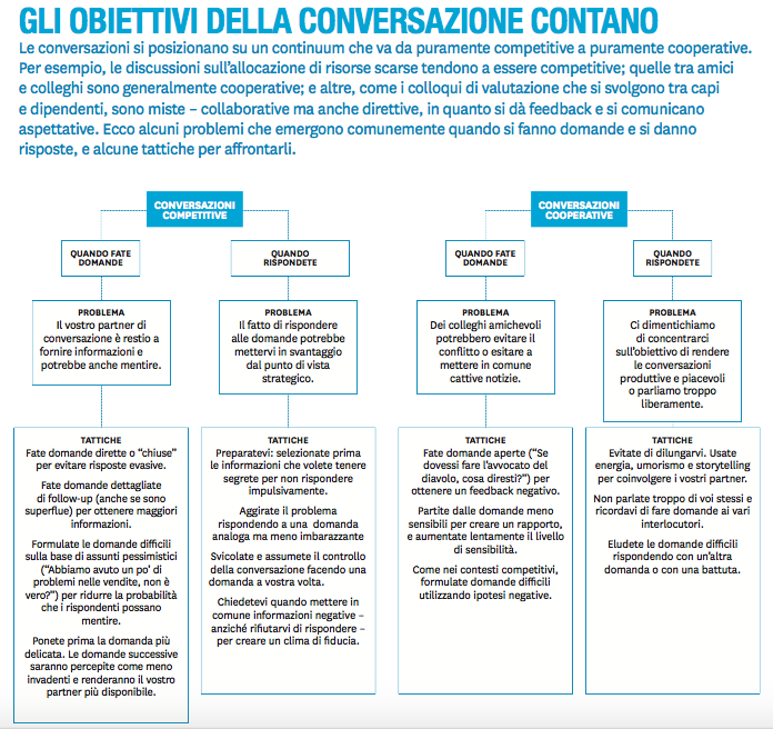 Le nostre ricerche suggeriscono vari approcci che possono accrescere il potere e l’efficacia delle domande. L’approccio più adeguato per una determinata situazione dipende dagli obiettivi dei conversatori - e in particolare dalla tipologia della discussione: se è cooperativa (per esempio, i due stanno cercando di costruire una relazione o di svolgere assieme un compito), competitiva (le parti cercano di strapparsi vicendevolmente informazioni sensibili o di portare avanti i propri interessi), o una combinazione delle due forme. (Si veda il box “Gli obiettivi della conversazione contano”).