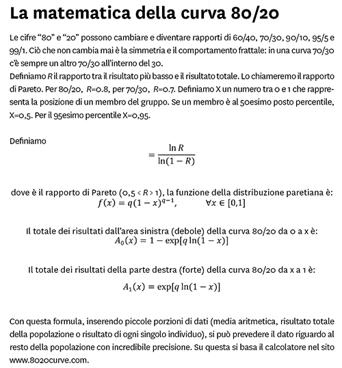 2) Il rapporto 80/20 è un frattale: figure all’interno di altre figure. Vale per il reddito dell’intera popolazione mondiale come per il fatturato delle dieci persone più ricche esistenti. 3) I più ragionano in termini di media o di curva a campana, ma nel business, come nella vita quotidiana, sarebbe più utile pensare in termini di curve esponenziali e leggi di potenza.