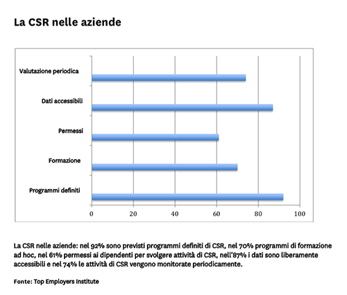 La consapevolezza in crescita è stata fotografata dalla ricerca di Top Employers Institute 2018 che ha analizzato la realtà “sostenibile” all’interno di oltre 1300 aziende di 115 Paesi del mondo, con un focus dedicato alle 90 aziende certificate Top Employers presenti sul territorio italiano. Dalla ricerca si scopre che nel 2018 il 92% delle aziende ha programmi definiti di Responsabilità Sociale, un dato in aumento del 5% rispetto a quello dell’anno precedente, che era dell’87%. Un coinvolgimento significativo che si concretizza con la partecipazione attiva dei dipendenti a programmi di Responsabilità Sociale, che viene incoraggiata e supportata con permessi straordinari nel 61% delle aziende e con la presenza e partecipazione attiva dell’executive management nel 36% dei casi.