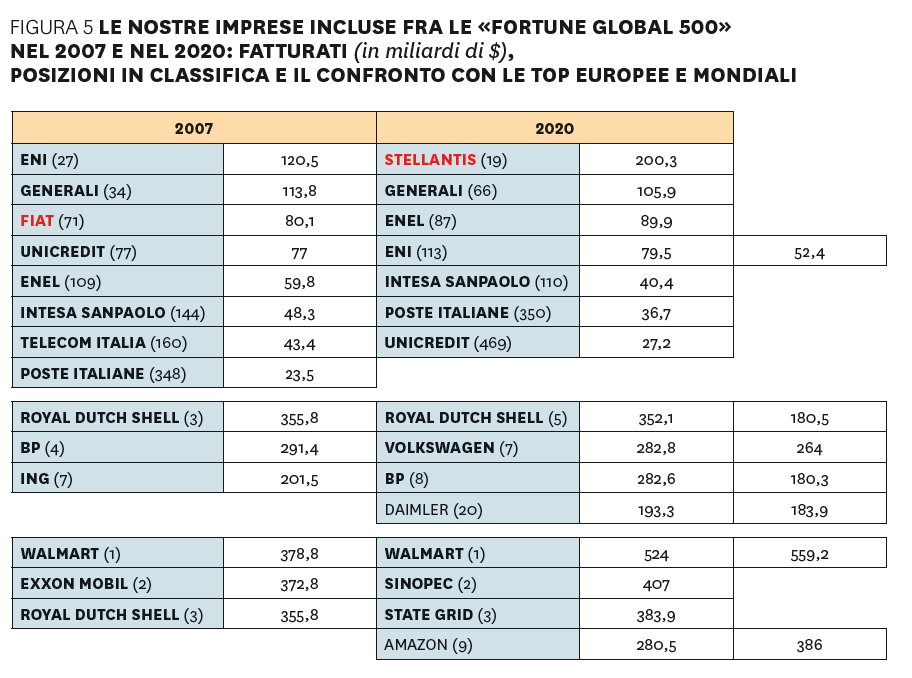 Scopo di questo articolo è di fornire una misura della presenza di “grandi” imprese in Italia, in comparazione con gli altri Paesi (gli europei in primo luogo) e – diacronicamente – con il periodo precedente la “grande crisi”. Mi sono avvalso di una serie di qualificate fonti internazionali, e specificamente dei dati sugli andamenti di Borsa forniti dal Financial Times, aggiornati a marzo 2021, e delle classifiche redatte con criteri alternativi da Forbes e Fortune sulle principali imprese del mondo: con il problema, per ambedue queste ultime, che essendo state pubblicate nel corso del 2020 non tengono in conto (se non marginalmente) dell’impatto della pandemia e delle operazioni di M&A più recenti (quale quella che ha portato alla formazione di Stellantis). Mi sono avvalso dei dati elaborati da Mediobanca sulle principali imprese operanti in Italia (filiali di multinazionali a base estera incluse). E, per il confronto diacronico, ho ripreso i dati relativi a fine giugno 2007 (l’anno precedente la “grande crisi” originata dai subprime), che avevo riportato nel mio libro con Giovanni Azzone L’Impresa (Rizzoli Etas, IV ed., 2007).