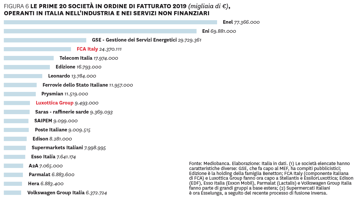 Stellantis ed EssilorLuxottica, formatisi di recente, meritano ovviamente una forte attenzione. Stellantis è divenuto con la fusione uno fra i maggiori gruppi mondiali per fatturato, in un comparto però, quale quello dell’auto, in via di completa ridefinizione per il passaggio all’elettrico e forse anche all’idrogeno. EssilorLuxottica è un leader mondiale nell’occhialeria, anche se minacciato nella fascia alta del mercato dai principali gruppi del lusso. Li potremo annoverare nel futuro fra i nostri campioni globali? Qualche incognita c’è, derivante dallo strumento – la fusione “alla pari” transnazionale – di necessità utilizzato per la loro formazione: uno strumento che tradizionalmente rende molto difficile la gestione dell’integrazione e lascia aperte e oggetto di forti conflitti (spesso con il coinvolgimento dei governi) le decisioni su come saranno strutturati gli headquarter e dove saranno localizzate le attività più avanzate. Con il rischio non piccolo, soprattutto nel caso di Stellantis (che ha il governo francese fra i suoi azionisti), di una quasi irrilevanza del nostro Paese nella ripartizione finale.