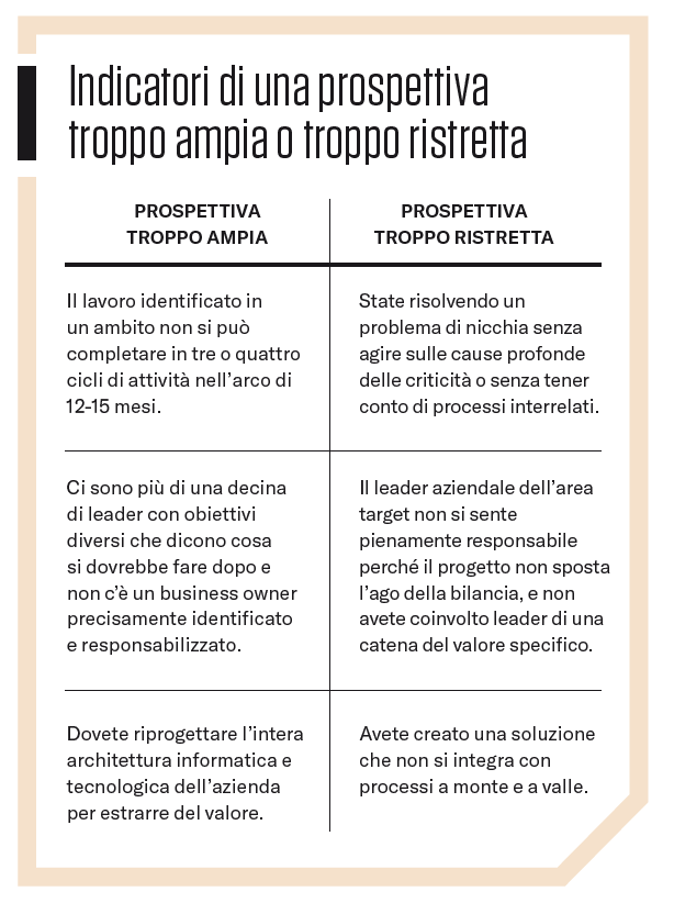 Può essere complicato stabilire esattamente fin da subito la portata delle iniziative IA. Noi suggeriamo ai CEO di prendere di mira aree di attività in cui l’IA possa fare una grossa differenza in un arco temporale ragionevole; qui è relativamente facile trovare uno sponsor, ottenere l'assenso degli stakeholder e mettere assieme un team; e ci sono più attività, e quindi più opportunità per utilizzare dati e asset tecnologici (Per scoprire se non avete definito correttamente il perimetro delle vostre iniziative, andate al box “Indicatori di una prospettiva troppo ampia o troppo ristretta”).