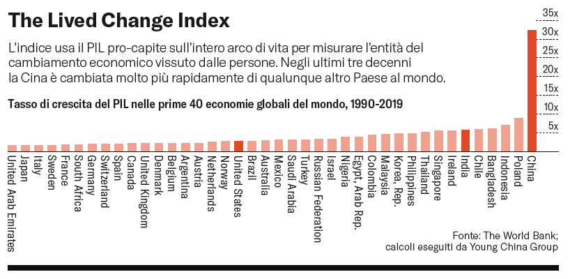 I millennial americani hanno vissuto grandissimi cambiamenti sin dal 1990, l’anno in cui sono nato. Prima è arrivato Internet. Poi sono arrivati i telefoni cellulari, seguiti dagli smartphone, dai social media, dalle app per gli incontri, dal mobile banking, dalla ricostruzione del genoma e da tante altre innovazioni. Gli americani del 1990 hanno visto crescere di circa 2,7 volte il PIL pro-capite degli Stati Uniti, un dato che sembra impressionante finché non ci si rende conto che i cinesi del 1990 hanno visto il loro PIL pro-capite crescere di ben 32 volte, un ordine di grandezza enormemente superiore. Nel 1990 il PIL della Cina rappresentava meno del 2% del totale globale. Nel 2019 la sua quota era balzata a quasi il 19%.