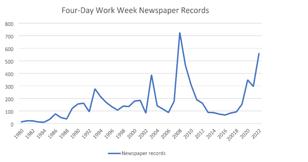 Ricerca dell’espressione four-day work-week sui quotidiani nazionali americani nel periodo 1980-2022