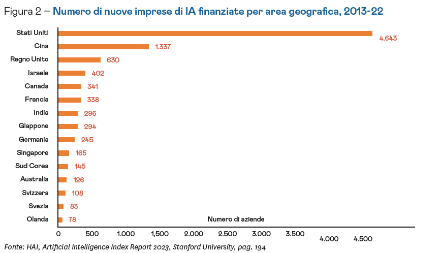 La ricerca accademica europea in IA è messa a dura prova dalla migrazione dei ricercatori, specialmente verso gli Stati Uniti, dove sono loro offerte condizioni favorevoli, con il risultato che un terzo dei ricercatori in IA delle università americane viene dall’UE. Problematico è poi il tasso di conversione dell’eccellenza accademica in opportunità imprenditoriali. Difatti, se solo un terzo dei migliori talenti europei in IA sono attivamente coinvolti nell’industria, nel 2022 il 54% dei creatori di modelli linguistici di grandi dimensioni era americano, contro il 3% dalla Germania, paese in testa alla classifica dell’UE. Non sorprende, allora, che le aziende europee menzionino la scarsità di talenti sul mercato del lavoro tra gli ostacoli all’adozione di IA.