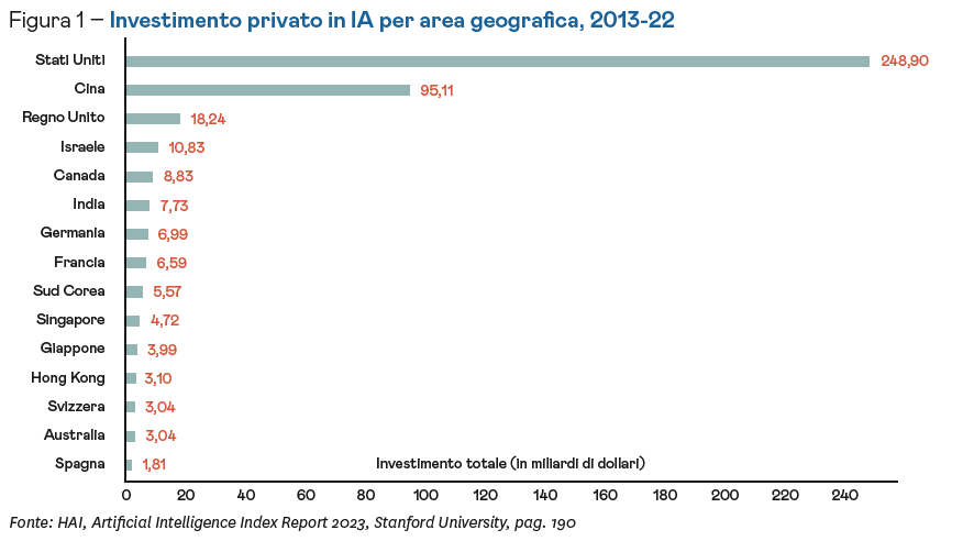 La scarsa disponibilità di capitale d’investimento è la causa principale dell’arretratezza dell’industria europea di IA: gli investimenti dell’UE sull’IA rappresentano meno del 10%, contro l’80% di Cina e Stati Uniti. Inoltre, l’investimento privato americano ammonta a 35 volte quello tedesco ($249mld vs $7mld), il più importante in Europa (Fig. 1). Due sono le ragioni d’una tale situazione: la rigidità del modello bancario e la debolezza delle aziende in fase di acquisizione. La prima fa sì che gli investitori istituzionali rappresentino solo il 14% del mercato del capitale di rischio contro il 35% negli Stati Uniti. La seconda conduce all’acquisto sistematico, da parte delle aziende statunitensi, delle start-up di successo. Ne conseguono esodo di talenti, perdita di proprietà intellettuale e dipendenza eccessiva dagli investitori statunitensi.