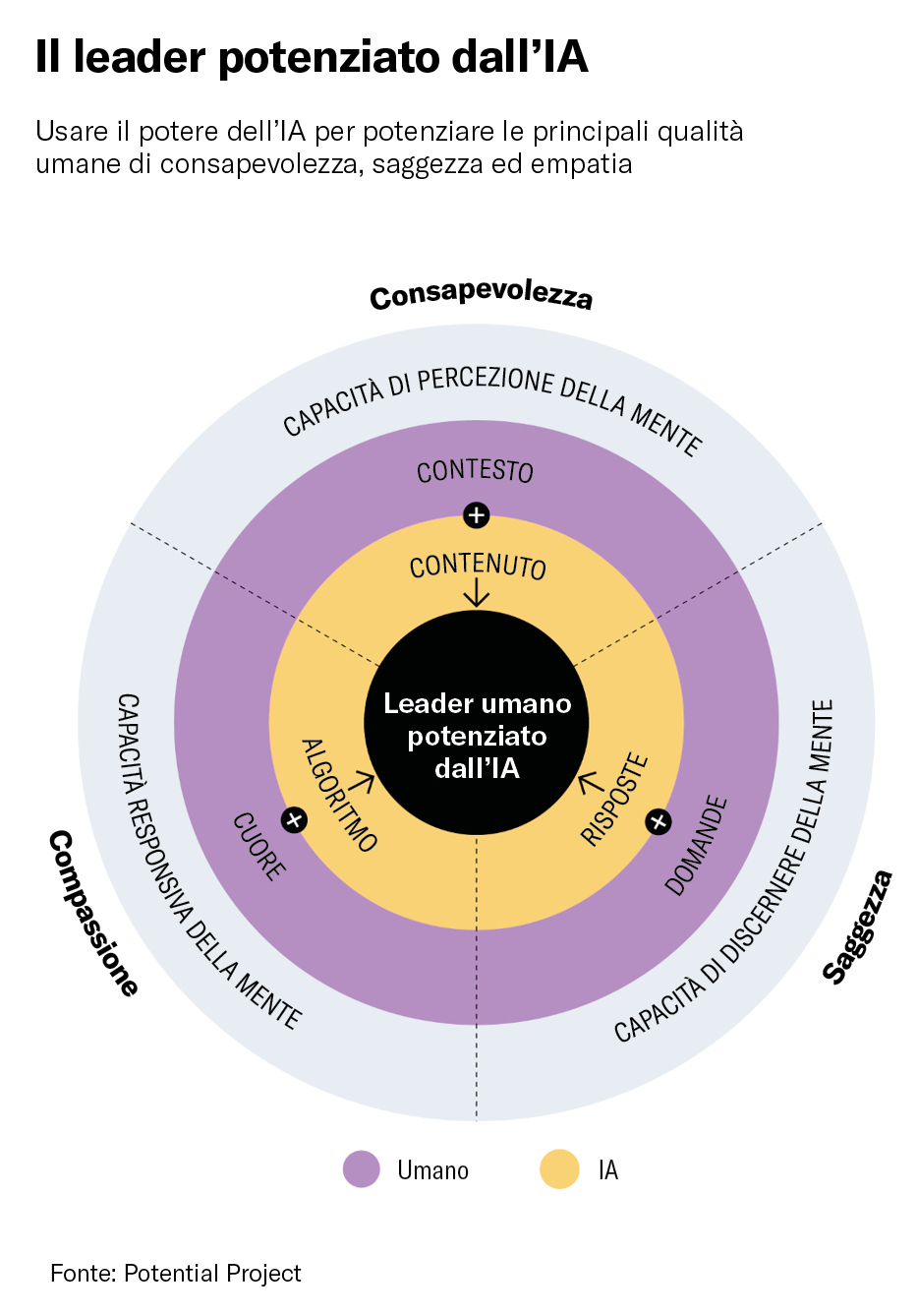 Il leader potenziato dall’IA è colui che integra l’uso dell’IA nella propria leadership in modi che migliorano ed espandono l’impatto umano positivo. Entrambi sviluppano le tre qualità umane fondamentali della consapevolezza, della saggezza e dell’empatia e abbracciano il meglio sia dell’uomo che dell’IA. Come funziona?