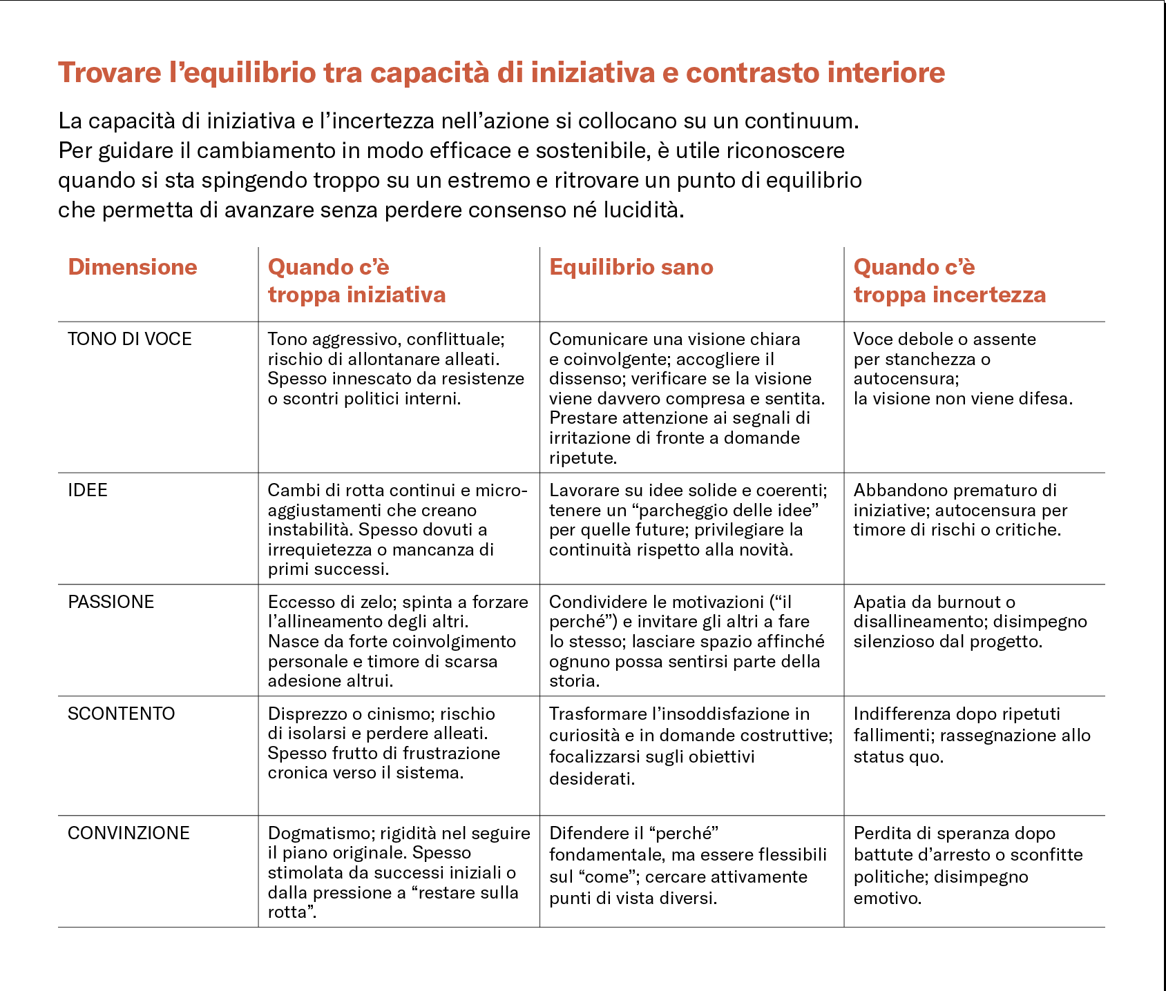 La convinzione porta a eccedere nell’iniziativa quando i primi successi o le pressioni esterne vi inducono ad aggrapparvi rigidamente al vostro piano originale. Il dogma sostituisce l’adattabilità e chi ha opinioni diverse si sente escluso. L’eccessiva incertezza attecchisce quando successive battute d’arresto, perdite politiche o dubbi personali minano la convinzione che il cambiamento sia ancora possibile, portando a una spirale di disperazione del tipo “Che senso ha?”.