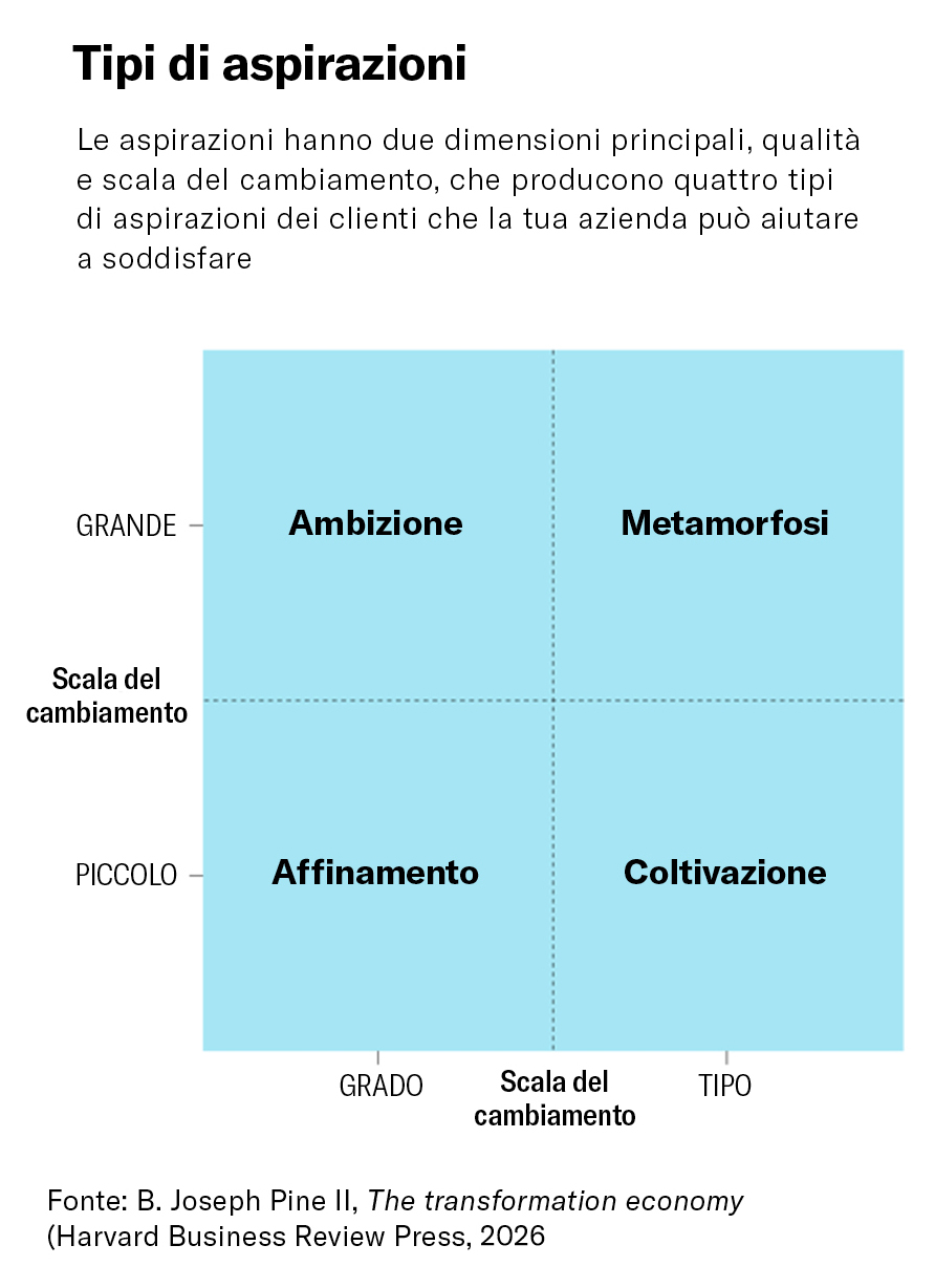 Nel suo nuovo libro The Transformation Economy: Guiding Customers to Achieve Their Aspirations, B. Joseph Pine II sostiene che esista una nuova offerta che le aziende possono proporre: il cambiamento. In questo articolo ripreso dal libro, esplora quattro tipi di aspirazioni che le persone hanno e come le aziende possono farvi riferimento quando creano i loro prodotti, servizi o esperienze.