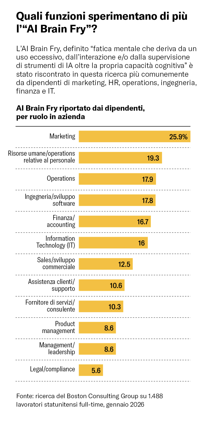 Il primo è l’affaticamento decisionale. Forse non sorprende che, quando esauriamo il nostro cervello con il carico cognitivo di un intenso lavoro con l’IA, abbiamo meno risorse mentali disponibili per prendere decisioni di alta qualità. I lavoratori del nostro studio che hanno provato il brain fry sperimentano un affaticamento decisionale superiore del 33% rispetto a quelli che non l’hanno fatto. Uno studio del 2018 ha stimato il costo di un processo decisionale non ottimale per un’azienda con un fatturato di 5 miliardi di dollari a 150 milioni di dollari all’anno. Un aumento del 33% dell’affaticamento decisionale dei lavoratori potrebbe aumentare tale costo di milioni di dollari all’anno.