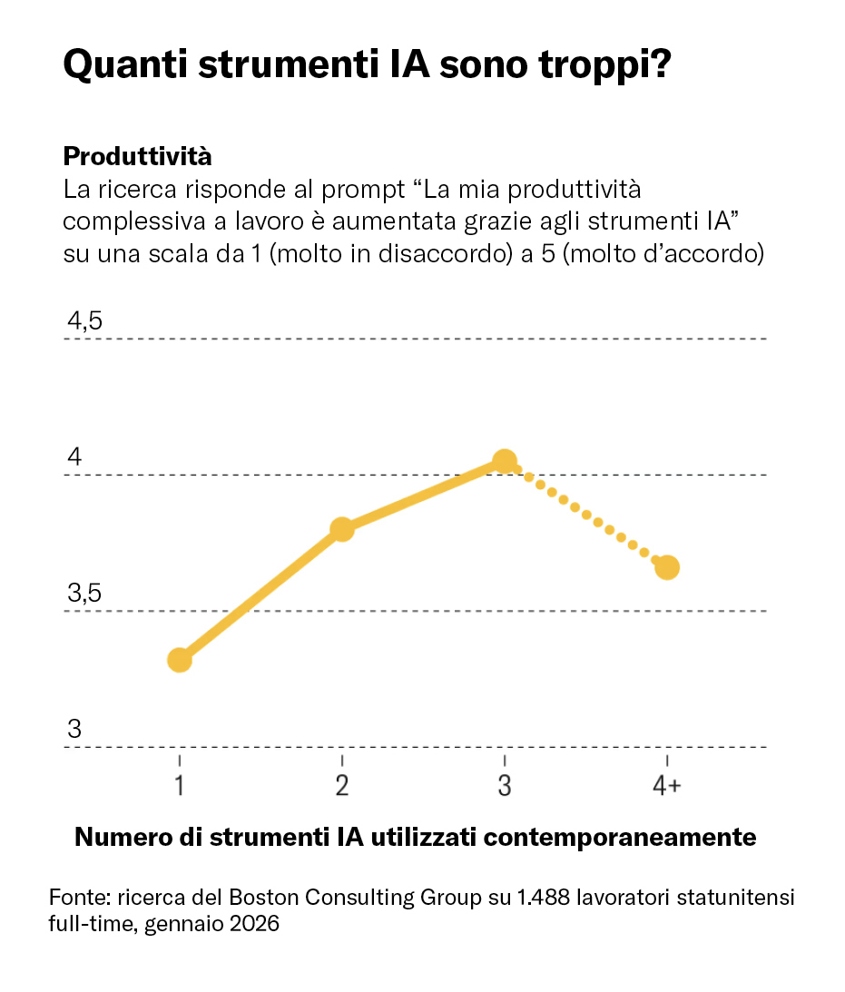 Abbiamo anche scoperto una relazione affascinante tra il numero di strumenti di IA utilizzati contemporaneamente e l’aumento della produttività percepita. Quando i dipendenti passano dall’uso di uno strumento di IA all’uso simultaneo di due, sperimentano un aumento significativo della produttività. Quando incorporano un terzo strumento, la produttività aumenta nuovamente, ma a un ritmo inferiore. Dopo tre strumenti, tuttavia, i punteggi di produttività calano. Il multitasking è notoriamente improduttivo, eppure ne siamo continuamente attratti.