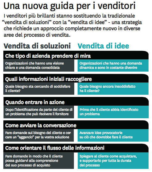 Il direttore vendite di un'azienda di servizi alle imprese ci ha parlato recentemente di uno dei suoi uomini migliori che, quando gli hanno chiesto di presentare una proposta strutturata, ha immediatamente dato alla riunione il tono che voleva. «Ecco la nostra proposta completa - c'è tutto quello che volevate», ha detto ai membri del comitato di direzione. «Ma siccome abbiamo solo un'ora da trascorrere assieme, vi chiederei di leggerla per vostro conto. Preferirei usare il tempo a disposizione per parlare delle tre cose che secondo noi avrebbero dovuto essere presenti nella richiesta e non c'erano, e per spiegarvi perché contano così tanto». Alla fine della riunione, il cliente ha mandato a casa gli altri due venditori che aspettavano ancora il proprio turno, ha abolito il processo di richiesta e selezione delle proposte e ha ricominciato da capo: quel venditore aveva detto chiaro e tondo ai top manager che si ponevano le domande sbagliate. Il venditore ha poi ridisegnato la proposta per armonizzarla con le competenze critiche dell'azienda e alla fine ha ottenuto il contratto. Come altri grandi venditori, sapeva che la strada giusta non era tentare di soddisfare i bisogni attuali del cliente ma ridefinirli. Invece di adottare un approccio tradizionale basato sulla vendita di soluzioni, ha scelto di "vendere idee", rivelando al cliente dei bisogni che non sapeva di avere.