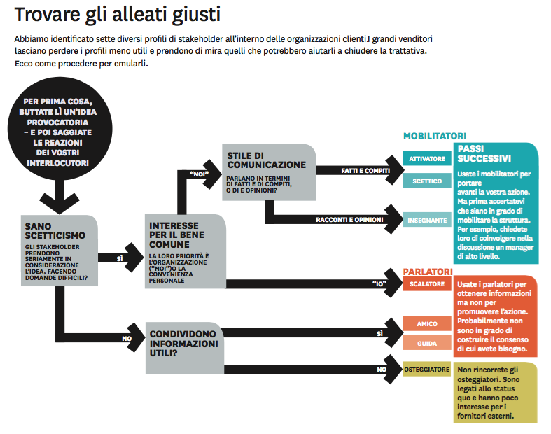 La ricerca in pratica. Abbiamo lavorato con grandi venditori di tutto il mondo per sviluppare una guida pratica all'identificazione dei mobilitatori. (Si veda il box "Trovare gli alleati giusti"). Il primo passo è valutare la reazione del cliente a un'affermazione provocatoria. (Per esempio, i venditori dell'azienda di forniture industriali Grainger iniziano la conversazione con il cliente citando dati di cui si desume che una quota assolutamente sproporzionata - il 40% - delle spese sostenute dalle aziende per la manutenzione, le riparazioni e le operations va a coprire acquisti non pianificati). Il cliente contesta l'affermazione alla radice, la prende per buona o tende a verificarla con delle domande difficili? Contrariamente a ciò che suggerisce la logica convenzionale, le domande difficili sono un buon segno; confermano che la controparte possiede il sano scetticismo di un mobilitatore. Se il cliente accetta l'affermazione senza fare domande, siete alle prese con un parlatore o con un osteggiatore - la differenza è che il parlatore vi darà quantomeno utili informazioni sulla sua organizzazione, mentre l'osteggiatore si sottrarrà al dialogo.
