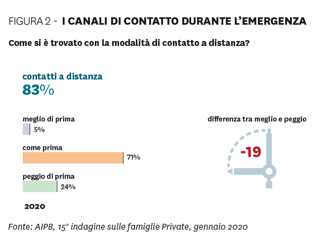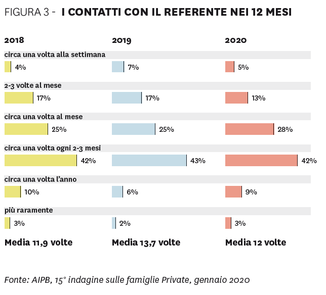 Un aspetto, quest’ultimo, coerente con la percezione da parte dei clienti di un allentamento della relazione con il proprio consulente, tradottasi nella sensazione di un minor numero di contatti lungo tutto il 2020 (e non solo nei mesi emergenziali). In realtà, non c’è stata una diminuzione significativa dei contatti rispetto ai due anni precedenti, ma c’è stata la percezione che i contatti siano calati. È plausibile pensare che anche questa sensazione sia imputabile al minor peso della componente più relazionale del servizio di consulenza, a dimostrazione di quanto questo aspetto sia legato alla percezione di qualità del rapporto (Figura 3).