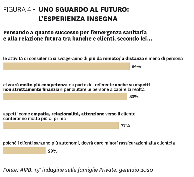 Abbiamo visto che il supporto relazionale è il più forte antidoto contro ansia e paura. Lo confermano le neuroscienze e, in parte, lo conferma anche l’esperienza portata da AIPB, dove la maggior parte dei clienti ha apprezzato l’assistenza ricevuta dai consulenti durante l’emergenza. Tuttavia, interrogati sul futuro, i clienti private sottolineano, in massa (83%), la necessità di consulenti più preparati sugli aspetti non strettamente finanziari e più relazionali del rapporto di consulenza, indispensabili per aiutarli a comprendere la realtà presente. Fra questi, empatia, relazionalità e attenzione verso il cliente avranno un’importanza crescente (77%) (Figura 4).