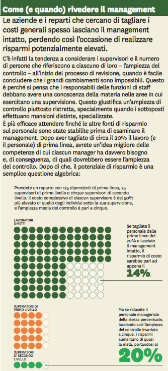 Siete da qualche tempo manager di successo di un grande reparto. Avete mantenuto un forte controllo. Ove possibile, avete tagliato i costi. Ma adesso è giunto un ordine dall’alto (da così in alto da non lasciarvi la libertà di discutere se sia saggio o fattibile) che vi ingiunge di tagliare i costi generali di un ulteriore 10, 20 o 30%, escludendo le liquidazioni. Ma proprio non riuscite a capire come si possa fare.