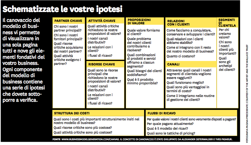 Primo, anziché dedicare mesi alla pianificazione e alla ricerca, i neo-imprenditori si convincono di avere solo una serie di ipotesi non ancora messe alla prova - delle supposizioni ragionevoli. Perciò, invece di scrivere un articolato piano strategico, i fondatori sintetizzano quelle ipotesi in uno schema denominato canovaccio del modello di business. È un diagramma di come l'azienda crea valore per se stessa e per i suoi clienti. (Si veda il box "Schematizzate le vostre ipotesi").