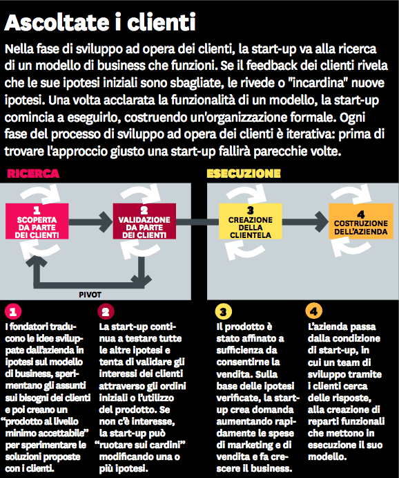 Secondo, le LSU usano un approccio "orientato all'esterno", chiamato customer development (sviluppo guidato dal cliente), per testare le proprie ipotesi. Vanno sul campo e chiedono ai potenziali utilizzatori, ai potenziali acquirenti e ai potenziali soci un feedback su tutti gli elementi del modello di business, inclusi le caratteristiche del prodotto, il pricing, i canali distributivi e delle strategie economicamente accessibili per l'acquisizione di clienti. L'enfasi è sull'agilità e sulla rapidità: le imprese neo-costituite assemblano rapidamente prodotti "al livello minimo accettabile" e sollecitano immediatamente il feedback dei clienti; poi, utilizzando gli input di questi ultimi per rivedere i propri assunti, riavviano nuovamente il ciclo, testando le offerte riprogettate e facendo ulteriori piccoli aggiustamenti (iterazione) o apportando modifiche più sostanziali (rotazione sui cardini) alle idee che non funzionano. (Si veda il box "Ascoltate i clienti").