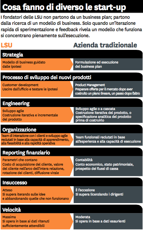 Stando alla logica convenzionale, la prima cosa che devono fare tutti i neoimprenditori è sviluppare un business plan - un documento statico che descrive le dimensioni di un'opportunità, il problema da risolvere e la soluzione che fornirà il nuovo prodotto o il nuovo servizio. Il business plan include tipicamente una previsione a cinque anni dei ricavi, dei profitti e del cash flow. Si tratta sostanzialmente di un esercizio numerico redatto solitariamente a tavolino, ancor prima che l'imprenditore abbia iniziato a costruire un prodotto. L'assunto è che sia possibile definire in anticipo la maggior parte delle incognite, prima di raccogliere i fondi e di mettere in pratica l'idea.