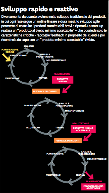 Terzo, le LSU applicano il cosiddetto sviluppo agile, che è nato nell'industria del software. Lo sviluppo agile opera in combinazione con il customer development. Diversamente dai tipici cicli annuali di sviluppo che presuppongono la conoscenza dei problemi dei clienti e delle specifiche tecniche richieste, lo sviluppo agile fa risparmiare perdite di tempo e di risorse attraverso lo sviluppo iterativo e incrementale del prodotto. È il processo con cui le start-up creano i prodotti "al livello minimo accettabile " che sottopongono sperimentazione. (Si veda il box "Sviluppo rapido e reattivo").