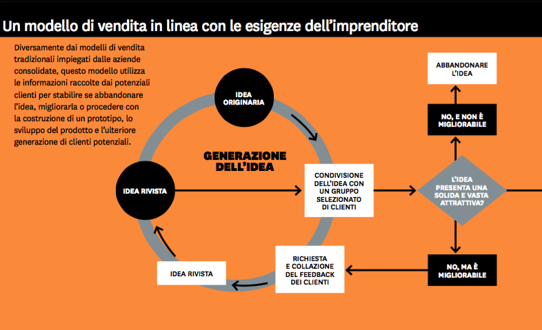 Sulla base delle interviste effettuate ai neo-imprenditori, abbiamo costruito un modello alternativo che è molto più adatto alle start-up (si veda il box "Un modello di vendita in linea con le esigenze dell'imprenditore"). Esso presuppone l'interazione con i clienti potenziali fin dal concepimento dell'idea - e molto prima che il prodotto venga materialmente creato. L'obiettivo di questi incontri è ottenere informazioni dal mercato non solo sulla struttura del prodotto ma anche sulle strategie di promozione, distribuzione e pricing. Dopo un giro di riunioni, l'imprenditore dovrebbe chiedersi se l'idea ha veramente un'attrattiva solida e vasta. La risposta a quella domanda dovrebbe portarlo a decidere se abbandonare l'idea, ricominciare daccapo o sviluppare un prototipo, ottenere un impegno condizionato dai possibili clienti, generare altri contatti e impegnarsi in altre attività tradizionali di vendita.