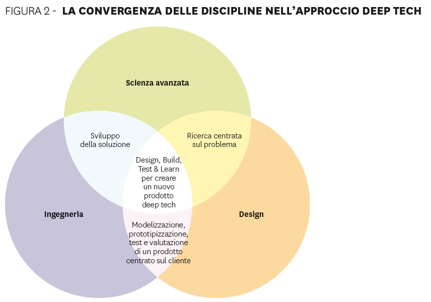 Le imprese deep tech si fondano, così, sulla convergenza tra diversi ambiti disciplinari: la scienza avanzata che si caratterizza per la generazione di conoscenza nuova senza porsi il problema dei suoi risvolti pratici; il design interessato, viceversa, allo sfruttamento della conoscenza esistente per soddisfare i bisogni umani trascendendo la comprensione dei fenomeni sottostanti; e l’ingegneria che, garantendo la fattibilità tecnica ed economica della soluzione, costituisce un ponte tra i primi due ambiti disciplinari (Figura 2).