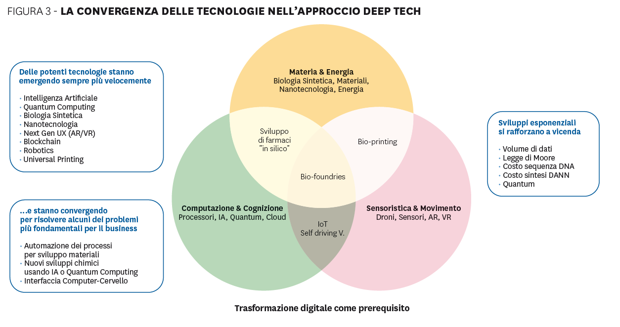 L’onda d’innovazione generata da internet ha metaforicamente travolto le imprese italiane che, ancora oggi, solo nel 3,8% dei casi risultano digitalmente “mature”[1]. L’onda che sta generando il deep tech può essere, invece, cavalcata, data la vocazione manifatturiera del sistema produttivo italiano. L’approccio deep tech si fonda, infatti, sulla convergenza tra diversi ambiti disciplinari (scienza e ingegneria, ma anche design) e tra diversi cluster tecnologici (computazione e cognizione, sensoristica e movimentazione, materia ed energia), allargando il focus dal mondo digitale (solo bit) a quello fisico (bit e atomi).