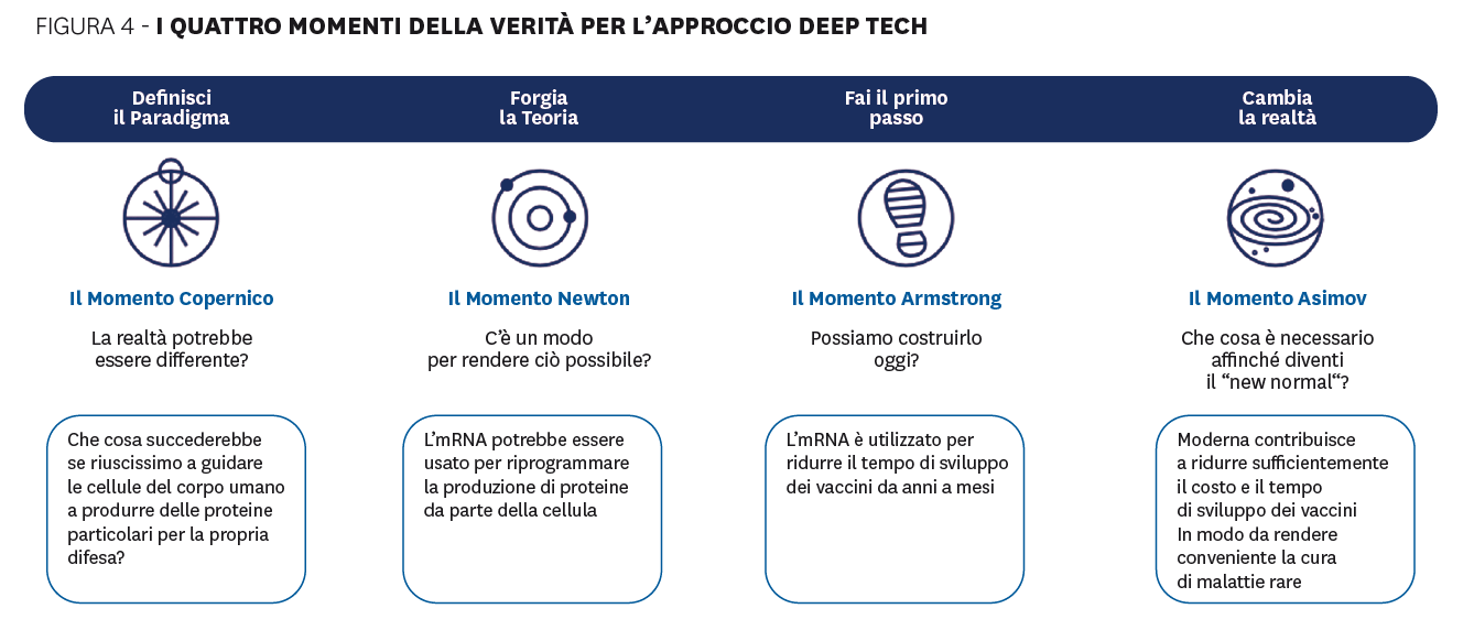 Attraverso quattro domande fondamentali si può creare un’ottima euristica per facilitare lo sviluppo di innovazioni rivoluzionarie. Queste domande identificano, perciò, anche i quattro momenti di verità per le imprese deep tech (Figura 4). Questi quattro momenti di verità sono: