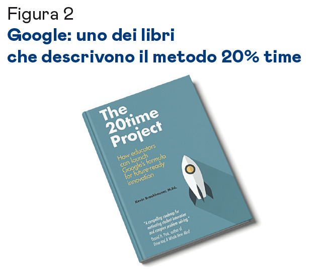 Questa modalità incomincia a diffondersi a livello internazionale soprattutto nell’ambito della pubblica amministrazione – in particolare nelle amministrazioni comunali delle città più innovative. Ma è sempre più frequente anche nelle aziende, soprattutto quelle operanti nel mondo del digitale. Tra le prime aziende nel cogliere l’importanza di questo fattore vi è Google, che lascia spazio ai propri collaboratori per poter studiare, proporre e addirittura lanciare nuove business idea. Se promettenti, l’azienda, oltre a concedere un po’ di tempo remunerato per lavorare sul progetto personale è anche disponibile a finanziare parte della sua operatività. È l’opzione chiamata “20% time” (figura 2), lanciata nel lontano 2004 e grazie alla quale l’azienda incoraggia i dipendenti a lavorare su progetti che li interessano. Alcuni dei prodotti più conosciuti di Google – come ad esempio Gmail e AdSense – sono nati proprio in questo modo. Si tratta di un nuovo capitolo della Corporate Entrepreneurship, dove non è solo l’azienda a proporre le direttrici evolutive della ricerca e sviluppo interna ma sono gli stessi dipendenti che devono convincere della potenzialità della propria idea e ricevono un budget (tempo e risorse) per dimostrare l’attendibilità della loro proposta. Il metodo ha avuto talmente tanto successo che si è diffuso – grazie ai molti manuali e libri prodotti – in molte altre organizzazioni.