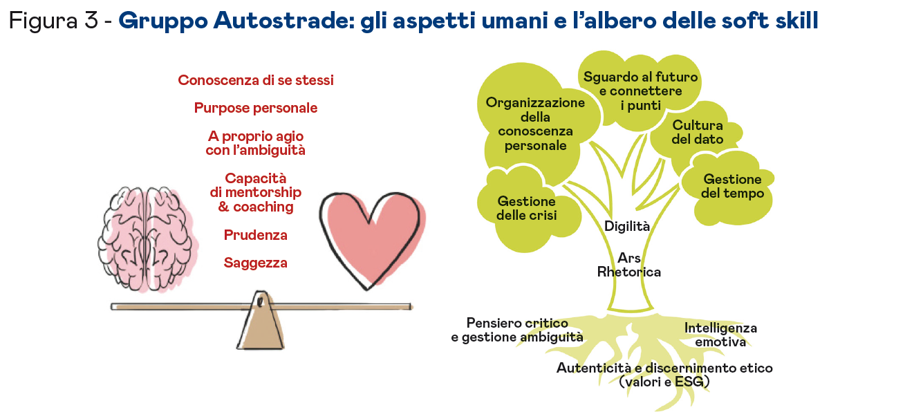 Infine, fra i casi di potenziamento dell’engagement attivato dalle dimensioni più soft, interessante è il progetto sviluppato all’interno del Gruppo Autostrade e centrato sul capitale emotivo. Poiché una parte del capitale umano – le competenze strutturate e codificabili – verrà progressivamente assorbita dal digitale, è necessario definire meglio il contributo delle risorse umane al valore dell’impresa non limitandola alle competenze tecnico-produttive. Il cuore del capitale emotivo sono infatti alcuni aspetti personali che aiutano a bilanciare fra razionalità ed emotività e – se ben collegati alla passione personale, a un set completo di soft skill (schematizzate nel framework dell’albero) e a un solido purpose aziendale – favoriscono il gioco di squadra, il senso di appartenenza, il benessere collettivo e, soprattutto, l’engagement (figura 3).
