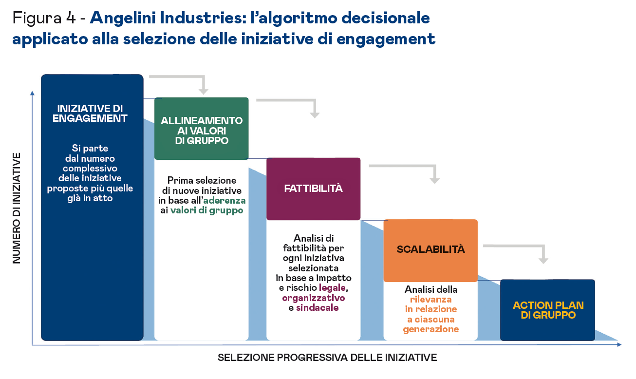 Questo metodo ha consentito di gestire l’articolazione del Gruppo Angelini Industries valorizzandone gli aspetti che generano valore per tutti se trattati in maniera omogenea dalle società operative e da tutte le generazioni, lasciando nel contempo totale flessibilità su tematiche legate a specifici contesti. È stato quindi creato un algoritmo con il quale Angelini Industries seleziona e prioritizza le iniziative che popolano il suo “engagement plan di gruppo” (figura 4). L’algoritmo, che si basa su 3 criteri di selezione: allineamento delle iniziative ai valori del gruppo, fattibilità e scalabilità intergenerazionale, non solo ha aumentato l’omogeneità valutativa delle iniziative, ma ha anche sensibilmente semplificato la scelta delle azioni su cui concentrarsi, accelerando la messa a terra degli stimoli raccolti dal percorso di ascolto. Inoltre il metodo – per la sua iteratività – rende naturale la sua continua evoluzione tramite l’introduzione di nuove proposte, purché siano in linea con i criteri di selezione – in primis la coerenza con i valori di gruppo e la loro concreta fattibilità intercompany.