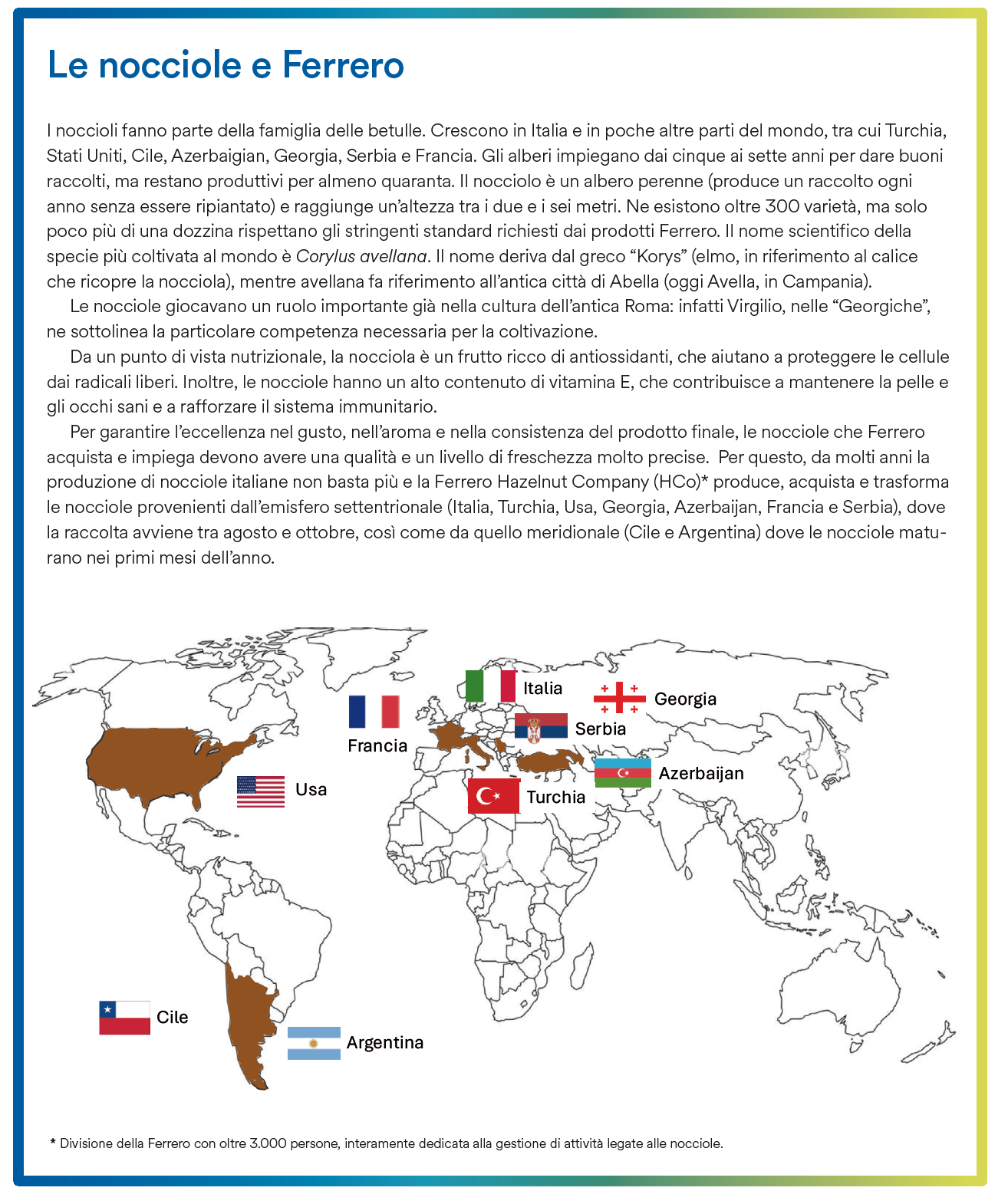 La nocciola è il simbolo di un’azienda che ne ha fatto l’ingrediente fondamentale dei suoi prodotti più apprezzati. Ed è allo stesso tempo, e malgrado la sua millenaria storia, una materia prima che ancora oggi richiede attenzioni e cura lungo tutto il suo ciclo di vita, dall’albero al prodotto finito, trasformato e degustato nel mondo. Dall’Italia alla Turchia, dagli Stati Uniti e Cile all’Azerbaijan, la filiera delle nocciole si fa sempre più globale e, per poter essere realmente sostenibile, richiede a Ferrero un impegno costante, non solo nella protezione del territorio dal punto di vista ambientale, ma anche, e soprattutto, nella tutela di coloro che vivono grazie alla sua coltivazione e che hanno diritto a vivere ed operare in un contesto virtuoso.