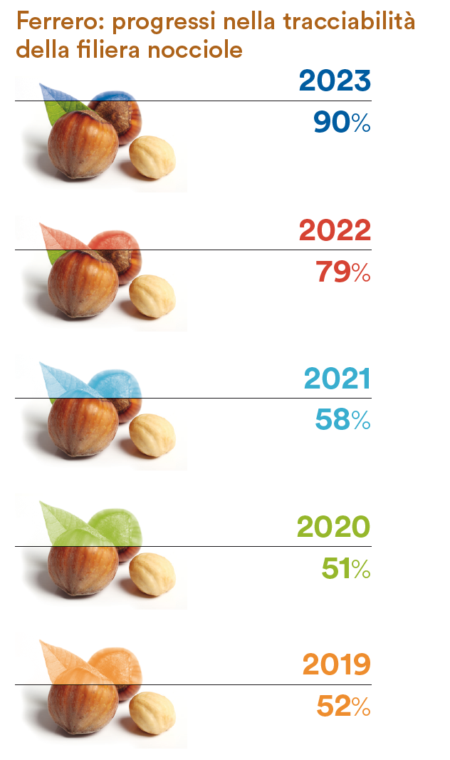 In Turchia, l’azienda collabora con più di 40.000 agricoltori e con le comunità locali nelle aree di approvvigionamento delle nocciole, con l’obiettivo di migliorare continuamente le pratiche agricole e sociali e la tracciabilità lungo tutta la filiera, al fine di assicurare nocciole sostenibili e di alta qualità nel rispetto dei diritti dei lavoratori.