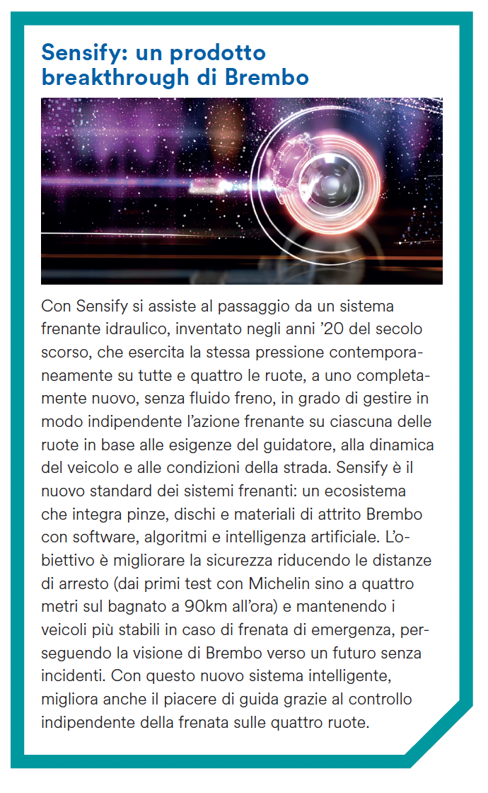 Al centro del modello di business di Brembo c’è l’innovazione che ha consentito lo sviluppo di concept di prodotti breakthrough nell’industria dei sistemi frenanti (vedi il box su Sensify). Oggi, l’azienda conta otto centri di ricerca e sviluppo nel mondo, oltre ai Brembo Inspiration Lab in Silicon Valley e a Shangai: centri d’eccellenza dedicati alle ultime frontiere dell’innovazione tecnologica, come intelligenza artificiale e applicazioni software. Per la ricerca e sviluppo Brembo investe il 6% del fatturato e impiega il 10% delle sue persone nel mondo, con l’obiettivo di cogliere tutte le opportunità di crescita continuando a innovare a fianco dei suoi clienti.