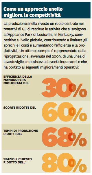 La produzione snella riveste un ruolo centrale nei tentativi di GE di rendere le attività che si svolgono all'Appliance Park di Louisville, in Kentucky, competitive a livello globale, contribuendo a limitare gli sprechi e i costi e aumentando l'efficienza e la produttività. Un ottimo esempio è rappresentato dalla riprogettazione, avvenuta nel 2009, di una linea di lavastoviglie che esisteva da venticinque anni e che ha portato ai seguenti miglioramenti operativi: