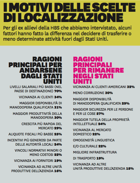 Mettendo assieme tutte le decisioni, gli Stati Uniti venivano scelti come location solo nel 32% dei casi. Per le decisioni sull'esportazione di attività dagli Stati Uniti, la scelta era negativa (si decideva di restare negli USA) solo nel 16% dei casi. Abbiamo chiesto agli intervistati di identificare i Paesi presi in considerazione per queste decisioni e siamo rimasti colpiti dalla eterogeneità delle opzioni. Le alternative più frequentemente considerate erano Cina, India, Brasile, Messico e Singapore. Ma l'elenco includeva 146 Paesi, molti dei quali non sono certo mete privilegiate dell'offshoring (come il Turkmenistan, il Suriname e il Senegal). Gli Stati Uniti competono veramente con il mondo intero per attrarre e trattenere gli investimenti.