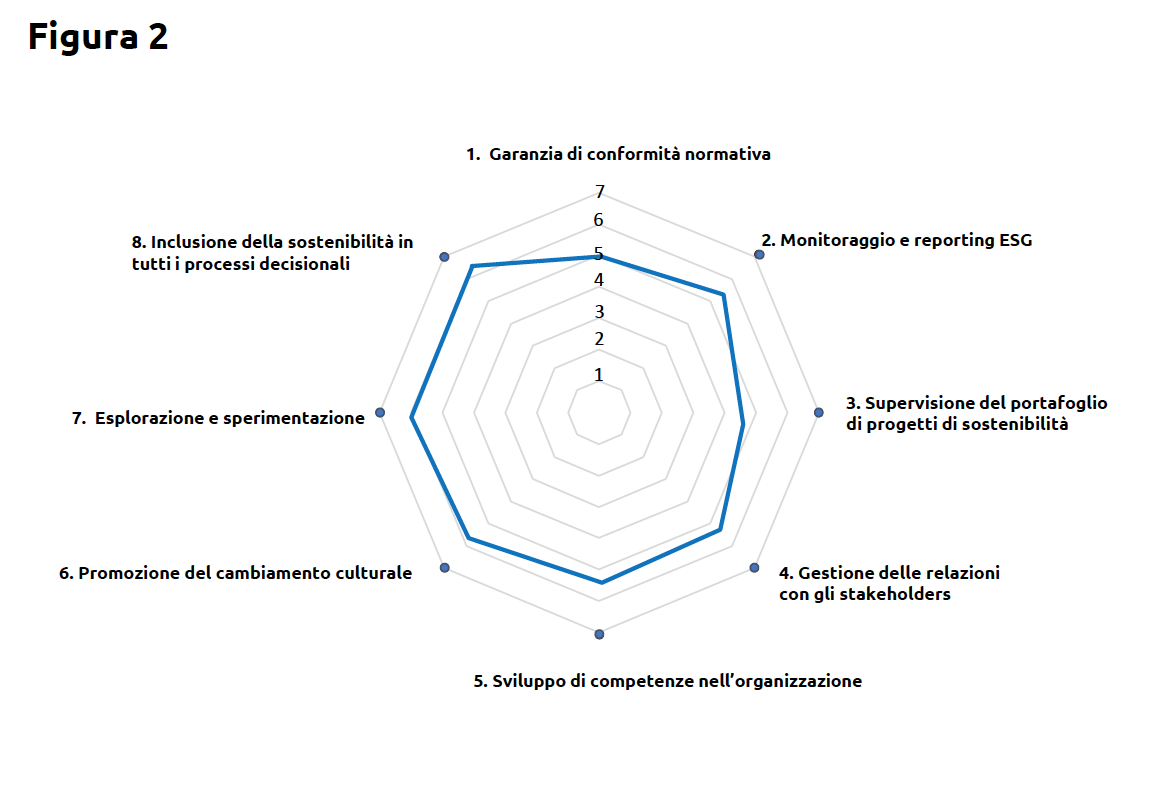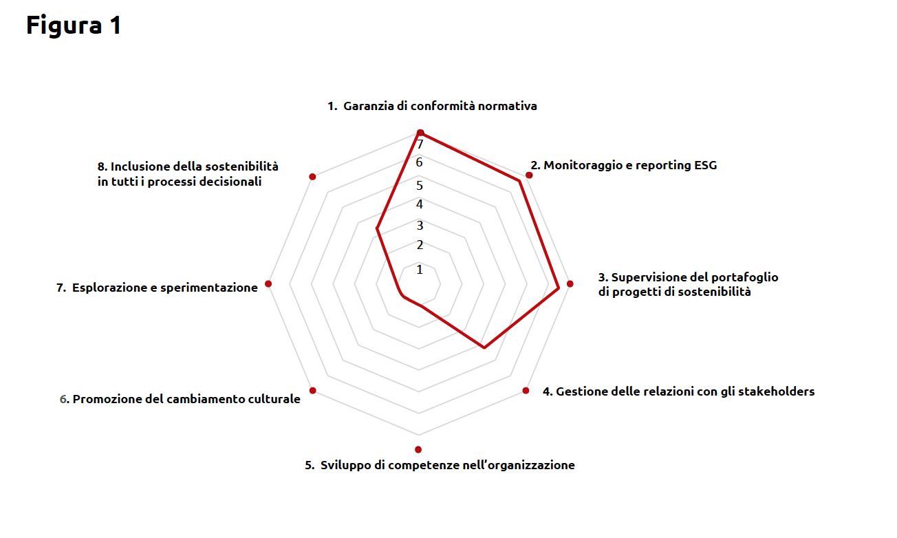 Va osservato che allo stato attuale solo una minoranza (35%) di questi ruoli organizzativi riporta direttamente all’Amministratore Delegato. Nella maggior parte dei casi la persona responsabile della sostenibilità riporta a una specifica Direzione aziendale: tipicamente, riportando al Direttore Operations quando si vuole sottolineare un mandato di efficienza produttiva; al Direttore Finanza quando il focus è sulle relazioni con gli investitori; al Responsabile delle Comunicazioni quando sono essenziali le pubbliche relazioni; o ancora all’area legale quando l'attenzione è rivolta alla conformità normativa. In altri casi invece, abbiamo osservato come il ruolo sia di fatto distribuito su due o tre Direzioni diverse. Anche in un’ottica ESG non è raro trovare una frammentazione: la "E" di Environment sotto il Direttore Operations, la "S" di Social sotto il Direttore Risorse Umane, la "G" di Governance sotto il Consiglio di Amministrazione.